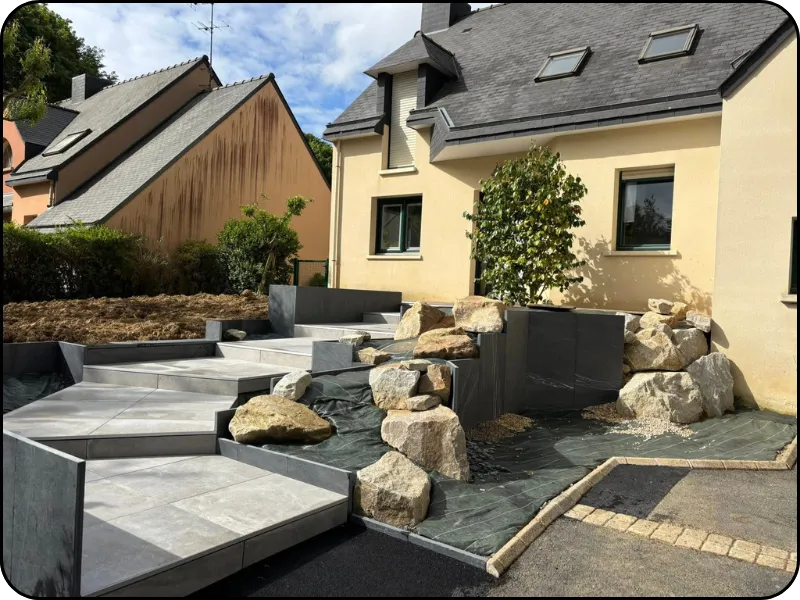 Terrasse : aménagement de terrasses, pose de dalles sur plot et revêtements résistants aux intempéries.